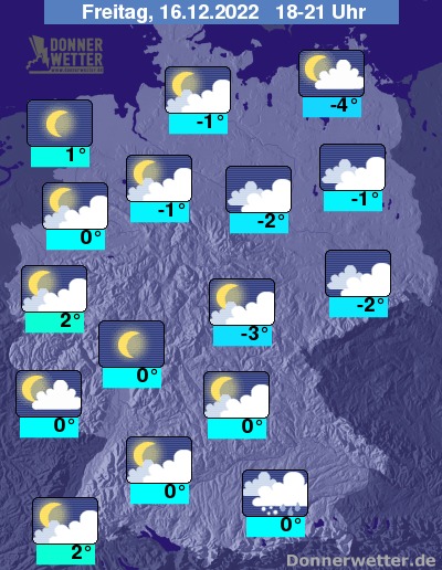 In der Nacht zum Samstag fällt direkt an den Alpen gebietsweise Schnee. Dicht bewölkt ist es auch verbreitet im Osten und Norden Deutschlands, dabei bleibt es meist trocken. Im übrigen Bundesgebiet ist es häufig nur locker bewölkt oder sogar sternenklar, dazu bleibt es trocken. Stellenweise bildet sich Nebel oder Hochnebel. Die Temperatur sinkt auf -3 Grad an der Nordsee und bis -10 Grad in Mittelfranken.
