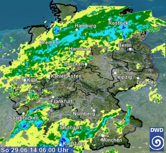Nord-Südteilung in Deutschland. Regen im Westen und Süden, Sonne im Osten und Norden in Deutschland. Im Regen werden am Montag nur 15-17 Grad C gemessen.