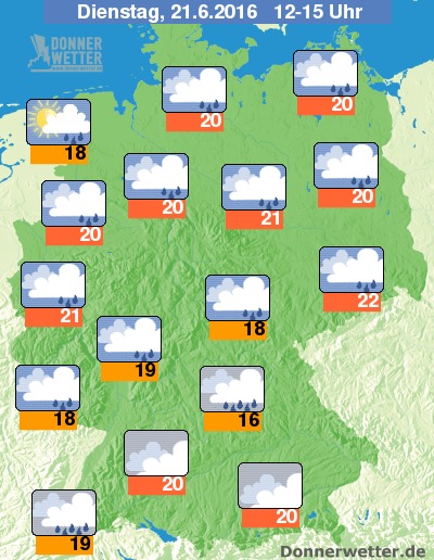 Heute Nachmittag ziehen überwiegend dichte Wolken übers Land, hier und da lockert der Himmel aber auch auf. Es bilden sich wiederholt Schauer, selten auch kurze Gewitter. Die Temperatur liegt bei 18 Grad im Saargau und 22 Grad in der Niederlausitz.