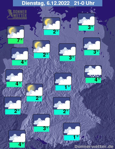Die Temperaturen gehen bis Mitternacht auf Werte um 7 Grad an der Nordseeküste und 1 Grad am Alpenrand zurück.