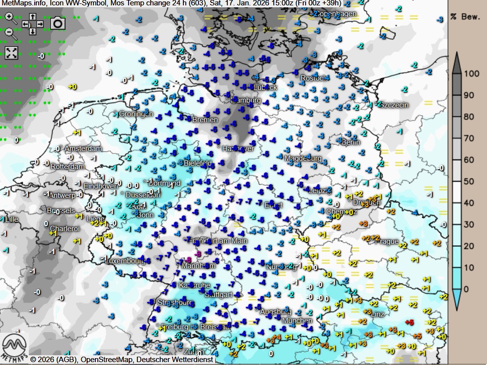 Die Temperaturkarte sowie die Wetterkarte mit den 24-Stunden-Temperaturveränderungen (15:00 Uhr) nach ICON: