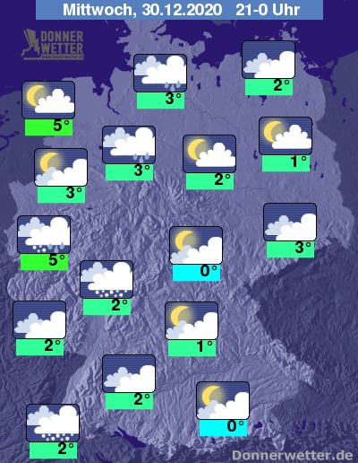 Die Temperaturen liegen anfangs zwischen 2 und 6 Grad und gehen bis kurz vor Mitternacht auf 0 bis 5 Grad zurück.