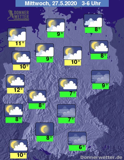 Bis zu den Frühstunden kühlt die Luft auf 5 bis 12 Grad ab, am mildesten bleibt es von der Ems bis ins Ruhrgebiet, am kühlsten wird es in Bayern.
