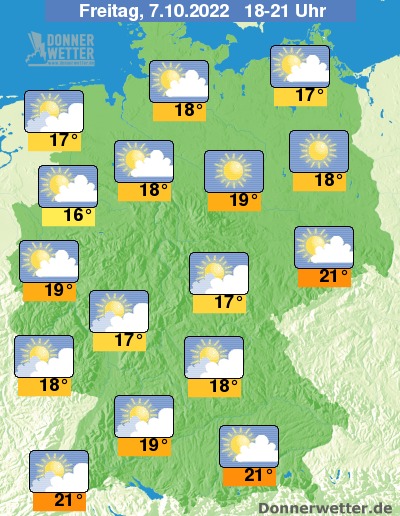 In der Nacht zum Samstag zieht im Nordwesten eine Kaltfront mit dichten Wolken und Schauern durch, sonst bleibt es meist locker bis aufgelockert, im Süden und über Sachsen eher stark bewölkt, jedoch trocken. Die Temperatur sinkt auf 13 Grad in Stuttgart und 8 Grad in Hannover.