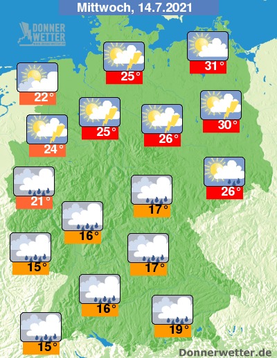 Am Mittwoch halten sich verbreitet dichte Wolken. An der Nord- und Ostsee ist es hingegen oft heiter, teils ziehen hier mehr Wolken durch, aber es bleibt dabei weitgehend trocken. Dagegen fällt über der Südwesthälfte Deutschlands verbreitet, teils langanhaltender, ergiebiger und gewittriger Regen. Im übrigen Bundesgebiet bilden sich örtliche Schauer und Gewitter. Die Temperatur steigt auf 15 Grad am Oberrhein und bis 31 Grad an der Müritz.
