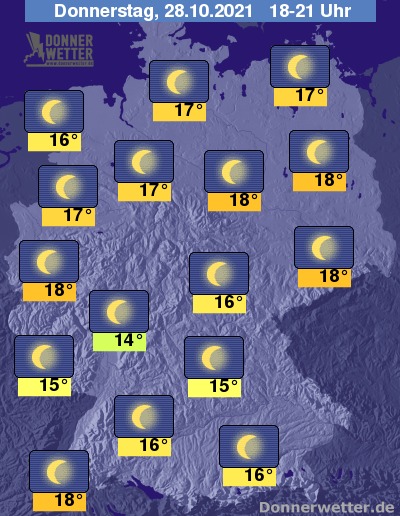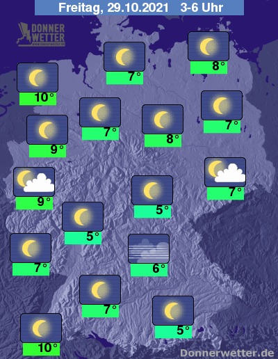 In der Nacht zum Freitag können hier und da mal lockere Wolken durchziehen, meist bleibt der Himmel aber sternenklar, dazu bleibt es trocken. Die Temperatur sinkt auf10 Grad in Freiburg und bis etwa 5 Grad in Jena.