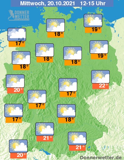 Heute Nachmittag ziehen über die Nordwesthälfte der Republik viele und teils dichte Wolken hinweg, dabei können sich im Nordwesten einzelne Schauer bilden, an der Nordsee sind zudem auch Gewitter möglich. Im übrigen Bundesgebiet ist es hingegen oft heiter, teils ziehen jedoch auch einige Wolken durch, dabei bleibt es aber weitgehend trocken. Die Temperatur liegt bei 17 Grad im Saargau und bis 22 Grad in der Lausitz. Es weht ein starker, oft auch stürmischer Wind, an den Küsten herrscht verbreitet Sturm.