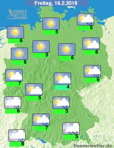 Im Süden halten sich zunächst kompaktere Schichtwolken. Südlich der Donau fällt dabei noch Regen, in den Alpen auch Schnee. Sonst reißt die Wolkendecke auf und vor allem in der Mitte und im Norden scheint längere Zeit die Sonne. Nur örtlich hält sich Nebel oder zäher Hochnebel. Die Temperaturen klettern auf 2 bis 9 Grad. Der Wind weht allgemein nur schwach bis mäßig. Lediglich im Küstenumfeld von Nord- und Ostsee frischt er zeitweise auf. Ab dem Abend trübt sich der Himmel von Frankreich her wieder ein.