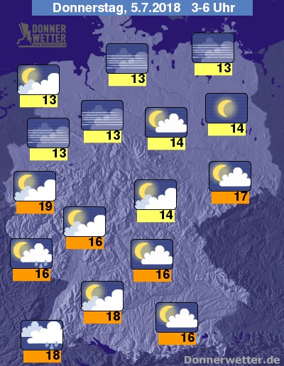 In der Nacht zum Donnerstag ist der Himmel über der Südhälfte teils wechselnd, teils auch stärker bewölkt, am Oberrhein sind dazu lokale Schauer oder Gewitter möglich, sonst bleibt es trocken. Weiter nach Norden hin ist es lediglich locker bewölkt oder sternenklar, dazu bleibt es ebenfalls trocken. Die Temperatur sinkt auf 19 Grad in Bonn und bis 13 Grad an der Müritz.