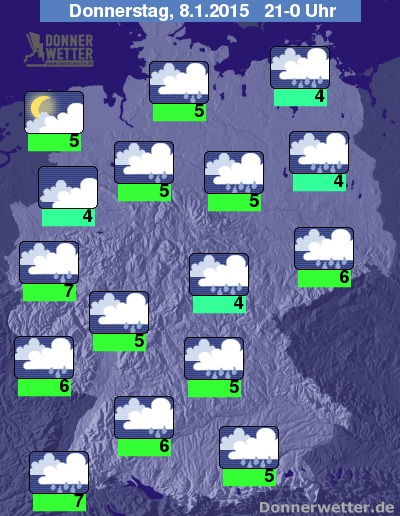 In der Nacht zum Freitag fällt vor allem in der Südosthälfte des Landes zunächst zeitweise Regen, im Norden und Westen fällt nur noch gelegentlich etwas Regen und im Nordwesten und äußersten Westen ist es auch gebietsweise aufgelockert bewölkt. Sonst und in den anderen Landesteilen bleibt es dagegen weitgehend bedeckt. Die Temperatur sinkt auf 6 Grad im Breisgau und bis 2 Grad im Coburger Land. Vor allem im Norden und Westen weht ein frischer bis starker, an der See und in Böen ein stürmischer Wind. An der See und auf den Hochlagen der deutschen Mittelgebirge sind die Böen teils orkanartig.