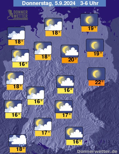 In der Nacht zum Donnerstag bleibt der Himmel über der Osthälfte sternenklar. In den übrigen Landesteilen ist es überwiegend wechselnd oder stark bewölkt und vor allem im Norden und Nordwesten sowie am Alpenrand sind in der ersten Nachthälfte noch letzte Schauer und Gewitter möglich.