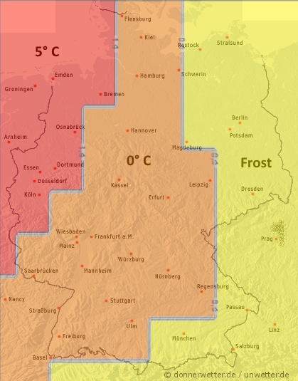 Heute Nachmittag ist es vom Nordosten bis in den Osten, sowie im Südosten des Landes noch meist locker bis aufgelockert bewölkt und es bleibt bis zum Abend noch trocken. Im übrigen Bundesgebiet ziehen hingegen weitgehend dichte Wolken durch, die verbreitet Regen, nach Osten hin auch teils Schneeregen oder Schnee bringen, dabei kann es örtlich glatt auf den Straßen werden! Im Westen klingt der Regen im Nachmittagsverlauf wieder ab und hier und da kann es auch etwas auflockern. Die Temperatur steigt auf 2 Grad in Vorpommern und bis etwa 9 Grad im Rheinland. Im Norden weht ein teils starker, an den Küsten ein starker und zum Teil stürmischer Wind.