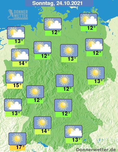 Am Sonntag ist es nach Auflösung örtlicher Nebelfelder verbreitet heiter bis sonnig, hier und da bleibt es aber auch ganztägig trüb, jedoch bleibt es trocken. Die Temperatur steigt auf 12 Grad in Neubrandenburg und bis 17 Grad in Freiburg.