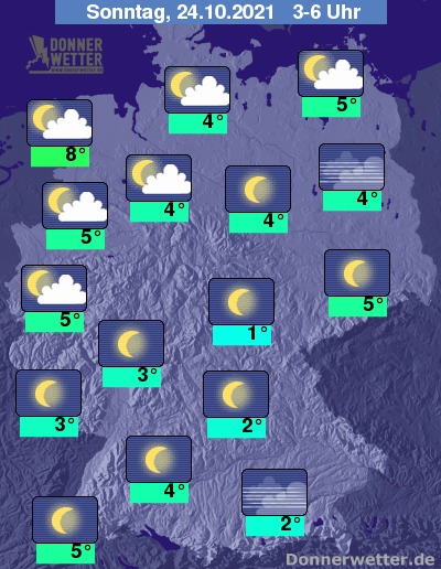 In der Nacht zum Sonntag zeigt sich der Himmel größtenteils sternenklar, stellenweise ist es auch neblig-trüb. Im Norden und Westen ziehen im Nachtverlauf einige, meist jedoch lockere Wolken auf. Es bleibt trocken bei Tiefstwerten von 8 Grad in Bremerhaven und bis 1 Grad in Jena.