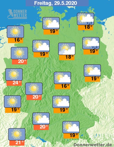 Die Höchsttemperaturen liegen im Norden und Osten meist etwas unterhalb der 20 Grad - Marke, im Südwesten und Westen oft darüber. In der Kölner Bucht werden fast sommerliche 25 Grad erreicht.