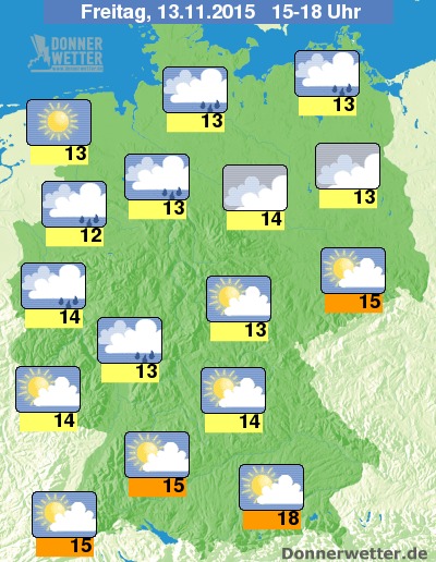 Die Temperaturen erreichen Werte um 12 Grad C in Münsterland bis 18 Grad C in Oberbayern.