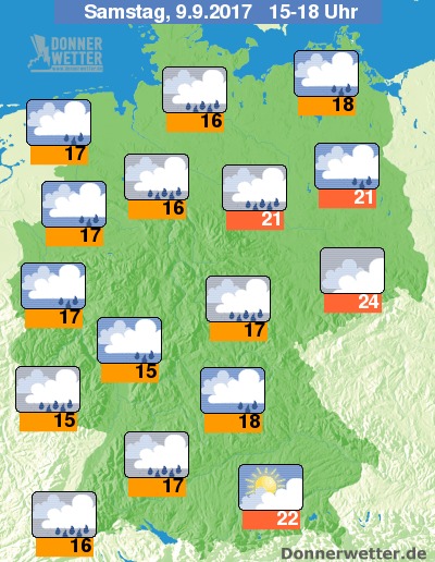 Je später die Stunde desto besser das Wetter? An diesem Samstag leider nicht... Auch am späteren Nachmittag und frühen Abend schauert oder regnet es verbreitet, die Temperaturunterschiede bleiben mit Werten um 15 Grad C im Südwesten und um 24 Grad C in der Sächischen Schweiz vergleichsweise groß.