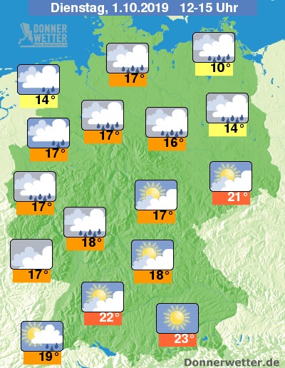 Die Temperaturen bewegen sich im Westen und Norden zwischen 15 und 19 Grad, im Nordosten, sowie an den Küsten bleibt es mit Werten zwischen 10 und 14 Grad kühler. Von Sachsen bis nach Bayern und ins östliche Baden-Württemberg können nochmals angenehme 20 bis 23 Grad erreicht werden.