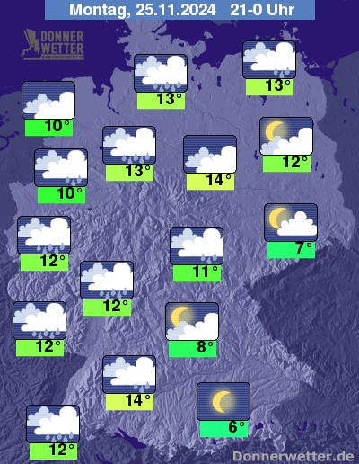 In der Nacht zum Dienstag verlagert sich der Regen in die südlichen und östlichen Landesteile. Von Nordwesten her lockern die Wolken in den Nachtstunden zunehmend auf und es bleibt weitgehend niederschlagsfrei.