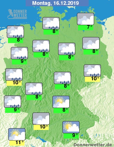 Heute ist es verbreitet stark bewölkt oder trüb, dabei fällt vor allem über der breiten Landesmitte, aber auch im Norden und Nordwesten gebietsweise Regen. Im übrigen Bundesgebiet bleibt es aber weitgehend trocken. Die Temperatur erreicht 7 Grad an der Müritz und bis 11 Grad im Oberrheingraben.