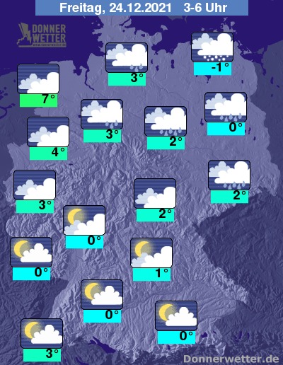 In der bevorstehenden Nacht ist der Himmel im Süden meist locker bis aufgelockert, teils auch stark bewölkt, dazu bleibt es hier trocken. Über der Nordosthälfte des Landes ist es bedeckt und es fällt zeitweise Regen, Schneeregen oder Schnee, dazu besteht erhöhte Glättegefahr! Im übrigen Land bleibt es bei weitgehend dichter Bewölkung trocken. Die Temperatur sinkt auf 7 Grad in Cuxhaven und bis -1 Grad in Stralsund.
