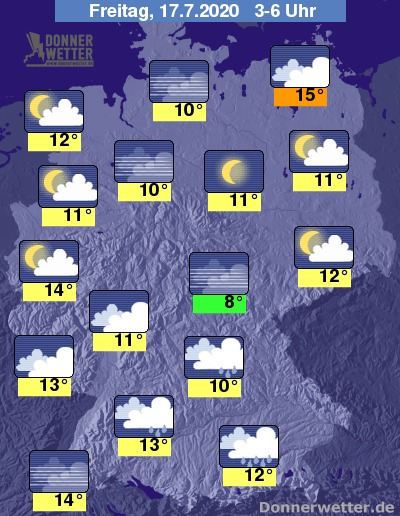 Bis zu den Frühstunden kühlt die Luft auf 7 bis 15 Grad ab, am kühlsten wird es im Thüringer Becken, am mildesten bleibt es auf Rügen.