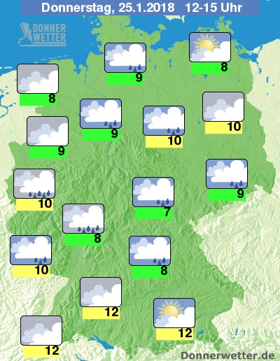 Ein Regenband zieht im Tagesverlauf nordostwärts über die Bundesrepublik hinweg. Über Mittag regnet es dabei vor allem in einem Streifen vom Niederrhein und der Pfalz bis an die Ostsee und ins Erzgebirge. Am Rand dieser Niederschlagszone ist der Himmel meist dicht bewölkt, die Sonne zeigt sich daher auch in den restlichen Landesteilen heute kaum einmal.