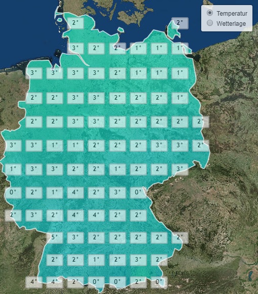 Die Tiefsttemperaturen liegen dabei am frühen Freitag Morgen fast deutschlandweit bei Werten knapp über dem Gefrierpunkt. Mit Frost ist nur am Alpenrand und in den Mittelgebirgen zu rechnen.
