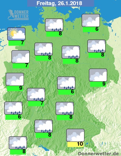 Am Freitag ändert sich an der Wetterlage zunächst kaum etwas. Das Regenband verharrt auch weiterhin in seiner Position und in einem breiten Streifen vom Schwarzwald bis an die polnische Grenze regnet es mitunter pausenlos weiter. Erst gegen Abend lassen die Regenfälle nach und die Regenpausen werden langsam länger. Mit etwas Sonne ist allerdings nur in Nordseenähe zu rechnen.