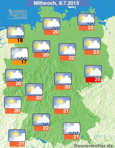Heute scheint vor allem über der Osthälfte mit Ausnahme der südlichen Landesteile häufig die Sonne und es bleibt trocken. Auch im Südwesten ist es zumindest anfangs oft heiter und trocken. Sonst zieht hingegen meist wechselnde oder auch starke Bewölkung durch und es bilden sich zeitweise Schauer, am Alpenrand und im Nordseeumfeld gebietsweise auch Gewitter. Die Temperatur steigt nur noch auf 17 Grad am Niederrhein und bis etwa 25 Grad in Niederschlesien.