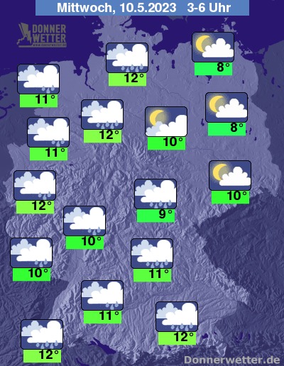 In der Nacht zum Mittwoch bleibt es über dem Osten und Nordosten bei meist lockerer Bewölkung weitgehend trocken. Im großen Rest des Landes zieht jedoch dichte Bewölkung durch und es bilden sich vielerorts Schauer. Die Temperatur sinkt auf 12 Grad in Hamburg und etwa 8 Grad in Berlin.
