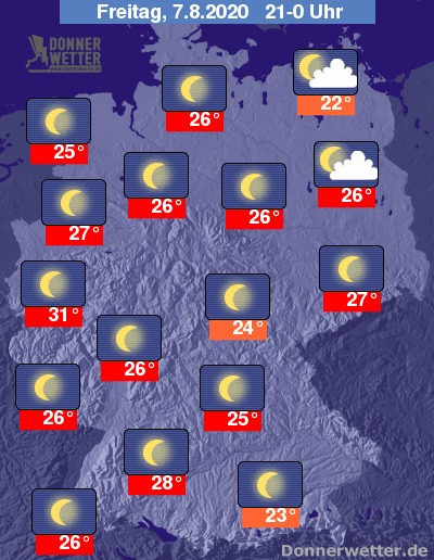 Die Temperaturen liegen am Abend noch bei Werten um 28 bis 35 Grad, in den späteren Abendstunden fällt das Thermometer auf hochsommerliche 31 Grad in der Kölner Bucht und 22 Grad an der Ostseeküste.