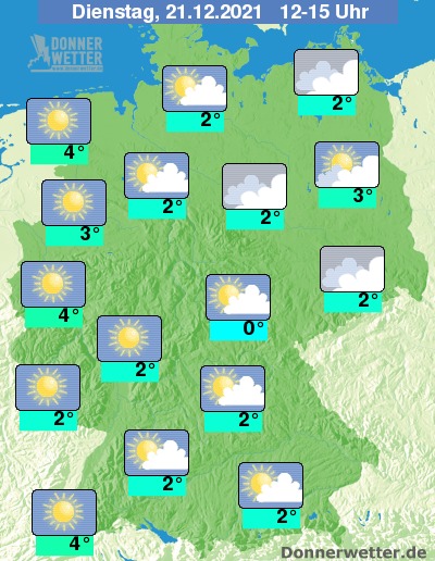 Heute Nachmittag ist es über der Westhälfte der Republik verbreitet heiter bis sonnig. Im übrigen Land ist es oft trüb, Aufheiterungen sind dennoch möglich. Es bleibt praktisch überall trocken, ganz vereinzelt können im Osten und Nordosten wenige Flocken oder Tropfen fallen. Die Temperatur liegt bei 0 Grad im Thüringer Becken und bis 4 Grad im Rheinland.