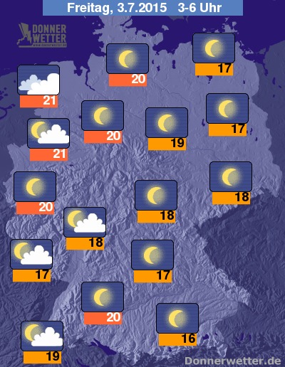 In der kommenden Nacht sind im Westen und Südwesten teils noch vereinzelte Gewitter möglich, sonst ist es in der Westhälfte des Landes teils sternenklar, teils locker bewölkt und dabei trocken. In der Osthälfte bleibt es die Nacht hindurch sternenklar und dazu trocken. Die Temperatur sinkt auf tropische 21 Grad im Ruhrgebiet und bis etwa 16 Grad im Chiemgau.