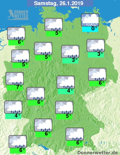 Heute halten sich verbreitet dichte Wolken, dabei fällt immer wieder bzw. zeitweise Regen, über der Osthälfte des Landes fallen die Niederschläge zum Teil auch als Schneeregen oder Schnee. Die Temperatur erreicht insgesamt mildere 0 bis 7 Grad.