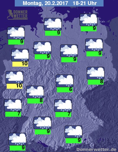 Heute Abend ist es im gesamten Bundesgebiet bedeckt und zudem auch regnerisch. Gebietsweise fällt auch langanhaltender Regen. Die Temperaturen bewegen sich zwischen 6 Grad im Vogtland und etwa 10 Grad im Münsterland.