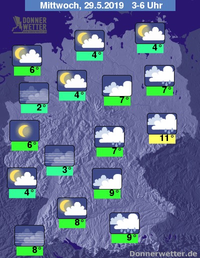 Bis zu den Frühstunden kühlt die Luft unter den dichten Wolken im Osten und Süden auf 7 bis 11 Grad ab. Dort wo der Himmel längere Zeit aufklart wird es mit 2 bis 6 Grad empfindlich frisch.