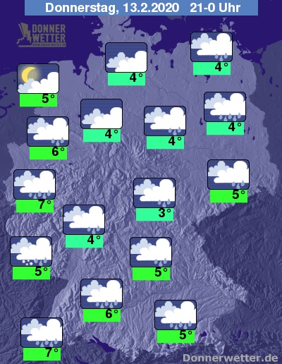 In den Abendstunden bleibt der Himmel über weiten Landesteilen stark bewölkt oder bedeckt. Auflockerungen beschränken sich später auf das Nordseeküstenumfeld - hier kann es am späteren Abend auch mal längere Regenpausen geben. Sonst muss in den kommenden Stunden immer wieder mit Regen gerechnet werden, die Schneefallgrenze liegt am Abend bei 800 bis 1.200 Metern.