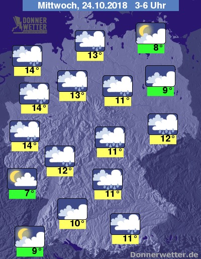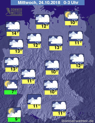 Verbreitet fällt in der Nacht Regen, die Temperaturen kühlen unter der dichten Wolkendecke nur wenig ab und erreichen Tiefstwerte um 14 Grad C in Ostfriesland und um 7 Grad C im Saarland.