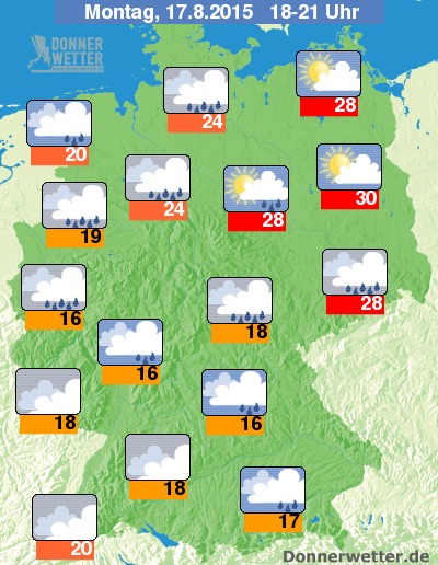 Heute Nachmittag wird es an der Nordseeküste und in Westen überwiegend bewölkt. Niederschläge sind zentral über Deutschland sehr wahrscheinlich. An der Ostseeküste wird es weitgehend bedeckt, die Sonne wird sich nur kurz zeigen. Im Saarland und im Schwarzwald ebenfalls viele Wolken und nur wenig Sonne. Die Temperaturen erreichen regnerische 16 Grad C am Taunus und bis zu 30 Grad C in Brandenburg.