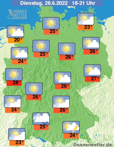 Heute Abend können sich an den Alpen bei oft dichten Wolken einzelne Schauer und Gewitter bilden, auch im übrigen Süden ist es oft stark bewölkt, dazu aber größtenteils trocken. Im Rest der Republik ist es hingegen verbreitet heiter bis sonnig und trocken. Die Temperatur liegt bei 20 Grad in Cuxhaven und etwa 28 Grad in Köln.