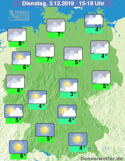 Die Temperaturen liegen im für die Jahreszeit entsprechenden Bereich zwischen 2 Grad im Bereich der Mittelgebirge und 8 Grad an der Nordsee.