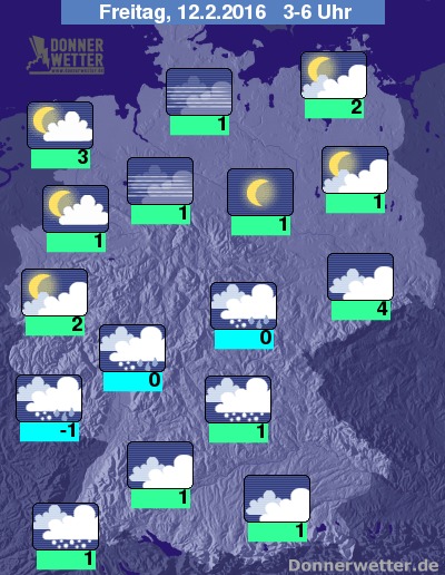 In der folgenden Nacht bleibt es über Schleswig-Holstein und Mecklenburg-Vorpommern meist stark bewölkt bei gelegentlich etwas Regen, vom Emsland bis in die Lausitz ist der Himmel locker bewölkt oder klar und es bleibt trocken, sonst ist zunächst verbreitet locker bis aufgelockert bewölkt und trocken. Im Nachtverlauf ziehen von Südwesten her jedoch dichte Wolken über die Südhälfte des Landes, dabei fällt zeitweise Regen, Schneeregen oder Schnee und besteht erhöhte Glättegefahr! Die Temperatur sinkt auf 4 Grad in Dresden und bis -1 Grad im Saargau.