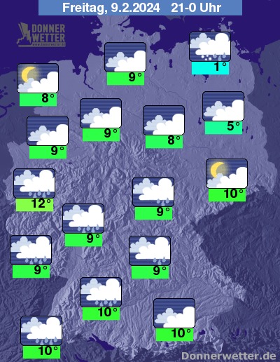 In der Nacht ist der Himmel meist stark bewölkt oder bedeckt. Im Norden und Osten bleibt es bis auf einzelne Schauer im Ostseeküstenumfeld anfangs weitgehend trocken. Von Südwesten her zieht in der ersten Nachthälfte Regen auf, der sich im weiteren Nachtverlauf auch auf die nördlichen Landesteilen ausdehnt.