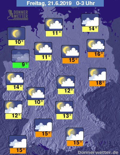 In der Nacht auf Freitag zeigt sich der Himmel über weiten Teilen des Landes locker oder aufgelockert bewölkt, südlich der Donau und später auch in weiten Teilen Bayerns und Baden-Württembergs bleibt der Himmel häufig bedeckt. Im westlichen Brandenburg sowie in Berlin können anfangs einzelne Schauer fallen, meist bleibt es in der Nacht aber trocken.