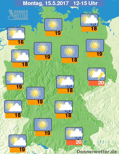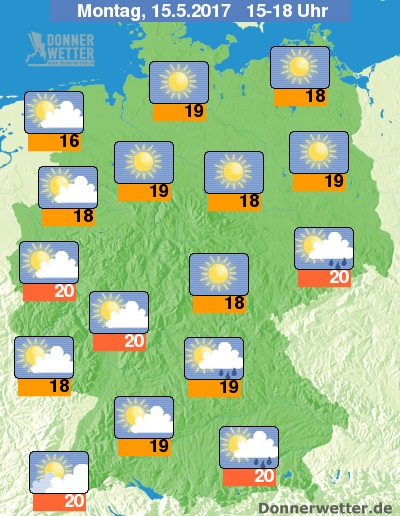 Am Nachmittag ist der Himmel meist heiter oder locker bewölkt, vor allem in der Nordhälfte sind auch längere sonnige Abschnitte möglich. Im Südosten sowie entlang der Ostsee treten zeitweilige Schauer und Gewitter auf, sonst bleibt es meist trocken.