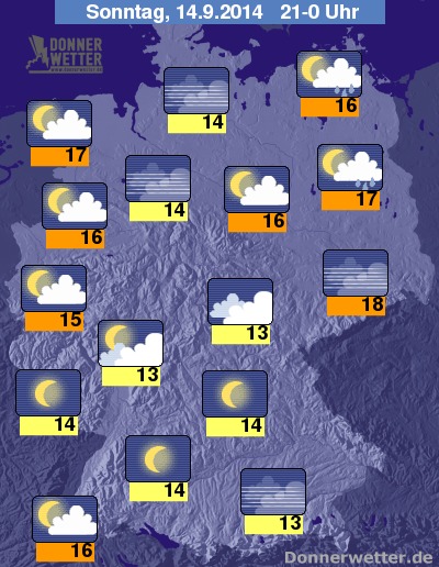 Heute Abend ziehen sich Schauer und Gewitter ans Ostseeumfeld und in den äußeren Osten von Deutschland zurück, sonst ist es verbreitet locker bewölkt oder auch sternenklar und es bleibt weitgehend trocken. Stellenweise bildet sich Nebel oder Dunst. Die Temperatur liegt bei 17 Grad an der Nordsee und 13 Grad im Odenwald.