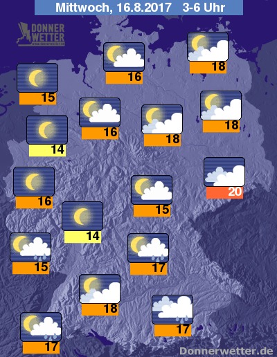 In der Nacht zum Mittwoch bleibt es über der Südosthälfte Deutschlands noch meist stark bewölkt und es bilden sich wiederholt Schauer und örtliche Gewitter. Im übrigen Land lockert und klart der Himmel hingegen größtenteils auf und von wenigen Ausnahmen abgesehen bleibt es auch trocken. Die Temperatur sinkt auf warme 20 Grad in Dresden und bis auf etwa 14 Grad am Taunus.