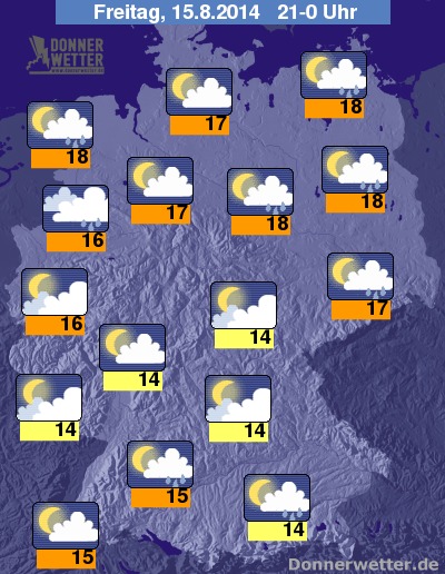 Heute Abend ist es zeitweise aufgelockert bewölkt, zum Teil können sich unter dichten Wolken aber auch weitere Schauer, vereinzelt auch kurze Gewitter entwickeln. Die Abendtemperatur liegt bei 18 Grad auf Rügen und kühlen 14 Grad an den süddeutschen Mittelgebirgen.