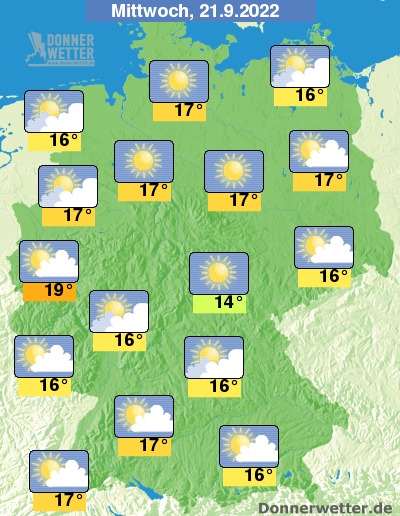 Am Mittwoch ist es überwiegend heiter oder sonnig, hier und da ziehen auch mehr Wolken durch, dabei bleibt es aber trocken. Die Temperatur steigt auf 14 Grad im Thüringer Becken und bis 19 Grad in der Kölner Bucht.